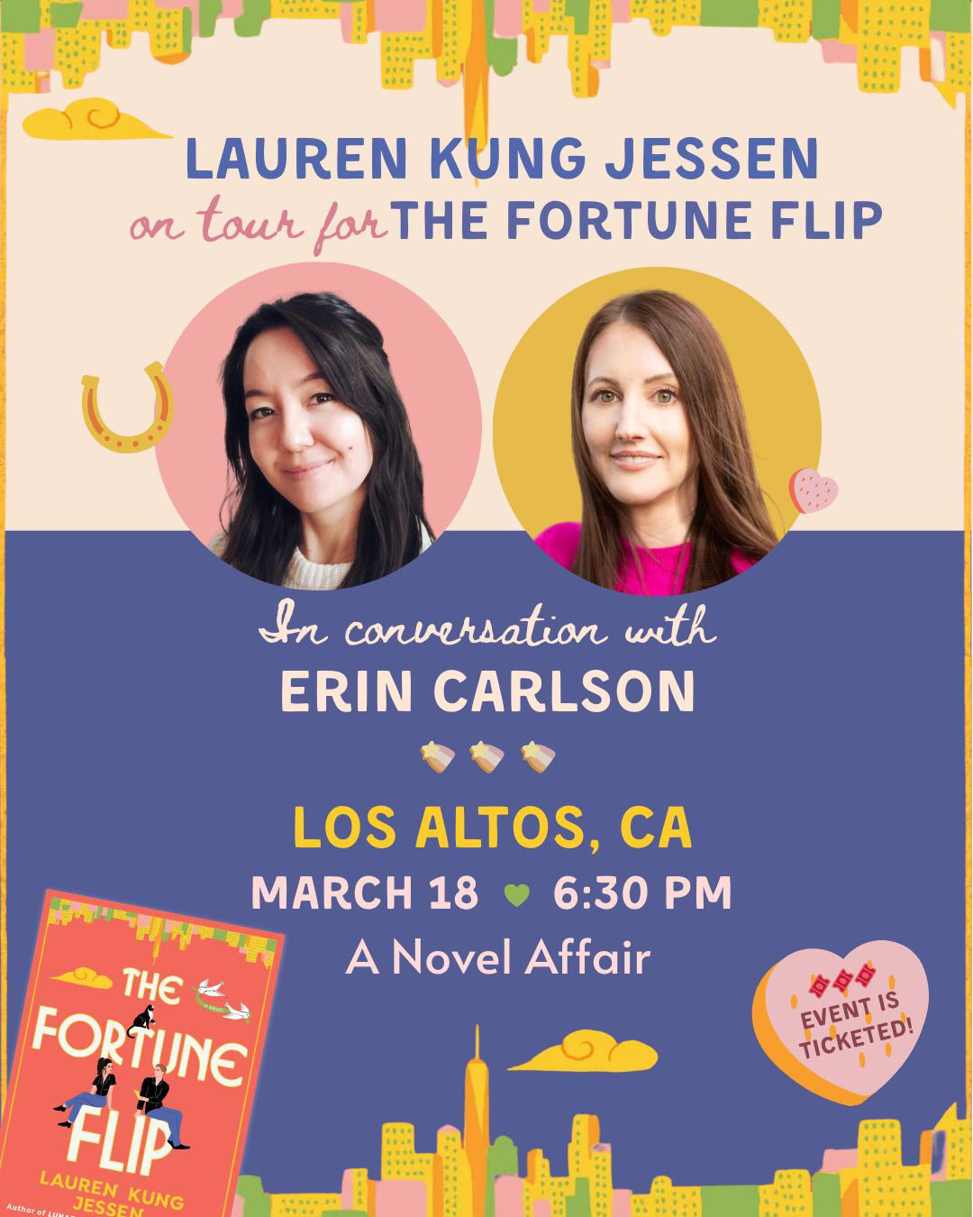 If you’re in the Bay Area, come celebrate the launch of Lauren Kung Jessen’s wonderfully charming rom-com, The Fortune Flip, at A Novel Affair in Los Altos. Get your tickets here! As Lauren says, “There WILL be book and movie chit chat, and Nora Ephron’s name will come out of our mouths at least 3 times!”
