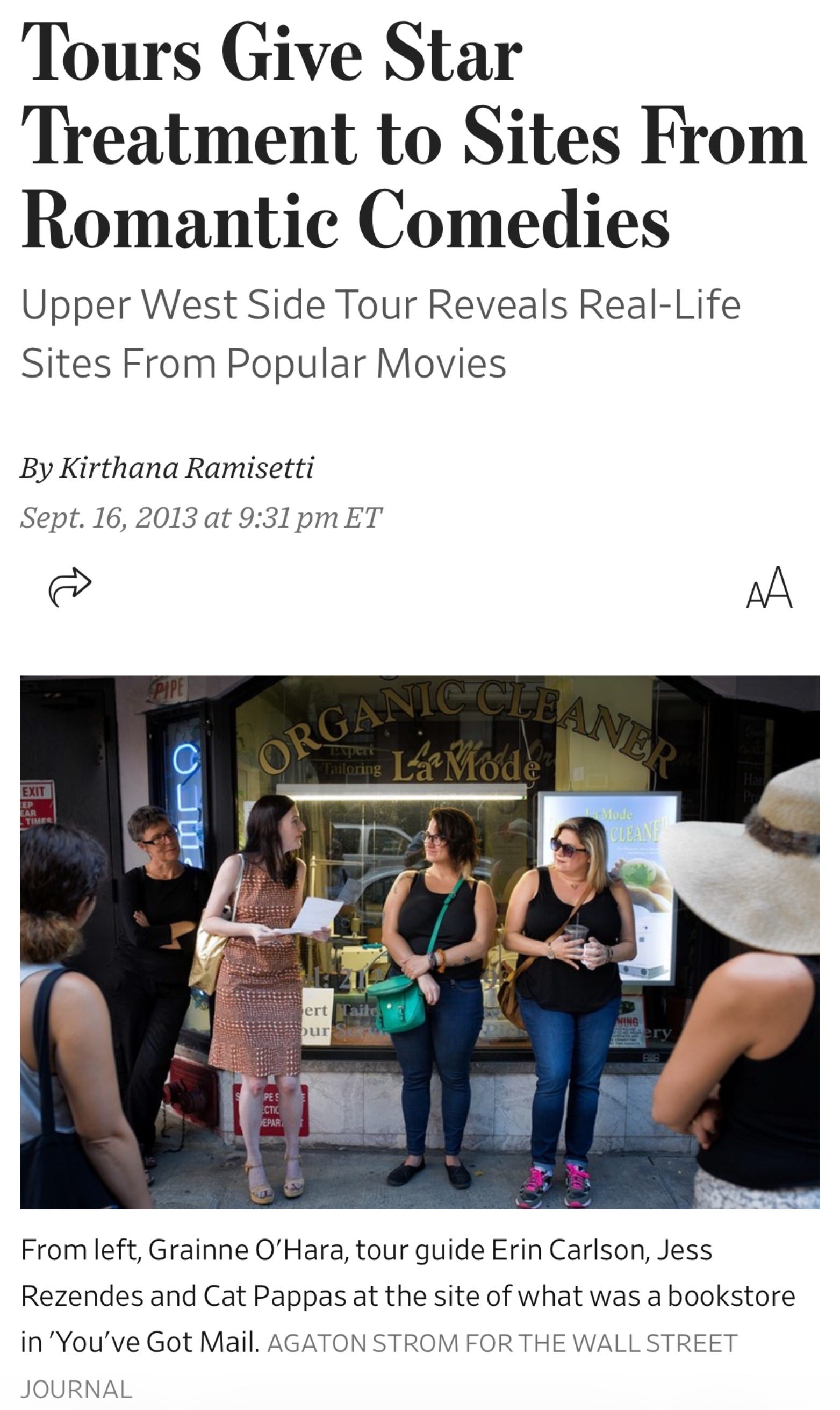 I’m a big fan of Chloe and appreciate that she wears her heart (and nerdiness) on her sleeve and rejects pressure to conform to her industry’s definition of cool. I loathe the phrase “I feel seen,” but yes, in this case, I felt pretty seen? Do I work in fashion? No! However, I do not have a single cool bone in my body. And yet, I’ve been fortunate to work alongside people who fully know this about me and embrace it. I would give all of them a kidney, including Kirthana Ramisetti, my screenwriting partner. In 2013, Kirthana wrote a story for The Wall Street Journal on the tour that I started with Jennifer Keishin Armstrong in New York City. It was the first of its kind and focused on locations from Nora Ephron’s When Harry Met Sally and You’ve Got Mail, both cozy love letters to Manhattan. At the time, I worked as an East Coast editor for The Hollywood Reporter and was eager to do something fun and different outside of journalism.