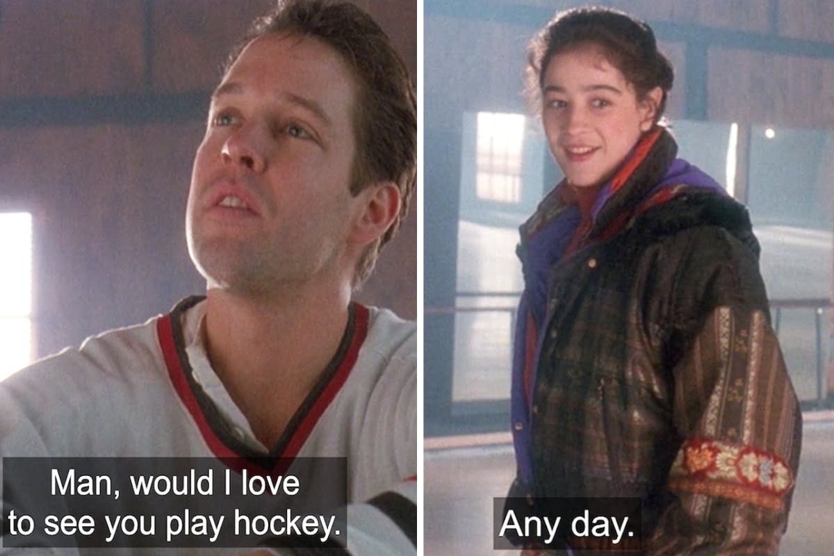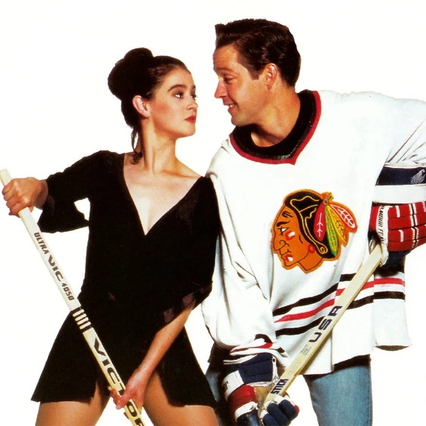 I rewatched The Cutting Edge the other night and it holds up. Since it was filmed in 1991, and 1991 was basically an extension of the Eighties, it has a wonderfully cheesy soundtrack and dated sportswear that looks like the stuff my father and his friends Stan and Steve wore in that era. (Hi, Dad! Wish you still had that turquoise Reebok windbreaker!) Many of the skating scenes are amusingly blurry, edited to disguise Sweeney and Kelly’s stunt doubles, but no one’s expecting actors to transform into Olympians following mere weeks of rehearsal — only Meryl Streep can do that. The big performance happens in stolen glances and sharp banter as the mismatched pair gradually commit to one another.